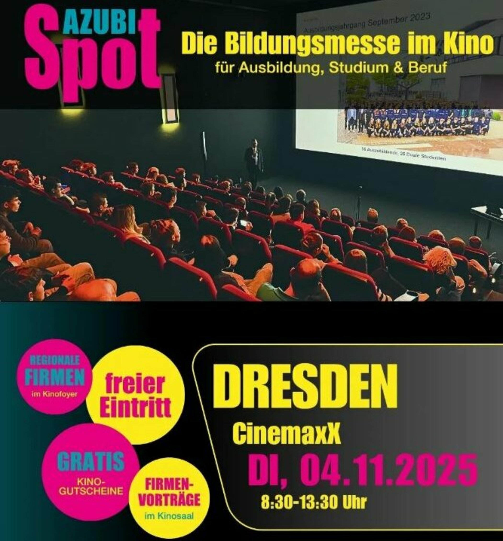Eine Bildungsmesse im Kino? Ja, genau! Wir stellen unsere Ausbildungsangebote zur AZUBISPOT im am 4. November 2025 von 08:30 bis 13:30 Uhr im CinemaxX in der Hüblerstraße 8, 01309 Dresden vor. Unser Messeteam freut sich darauf, dich zu unseren Ausbildungsangeboten zu beraten. Der Eintritt ist kostenfrei.