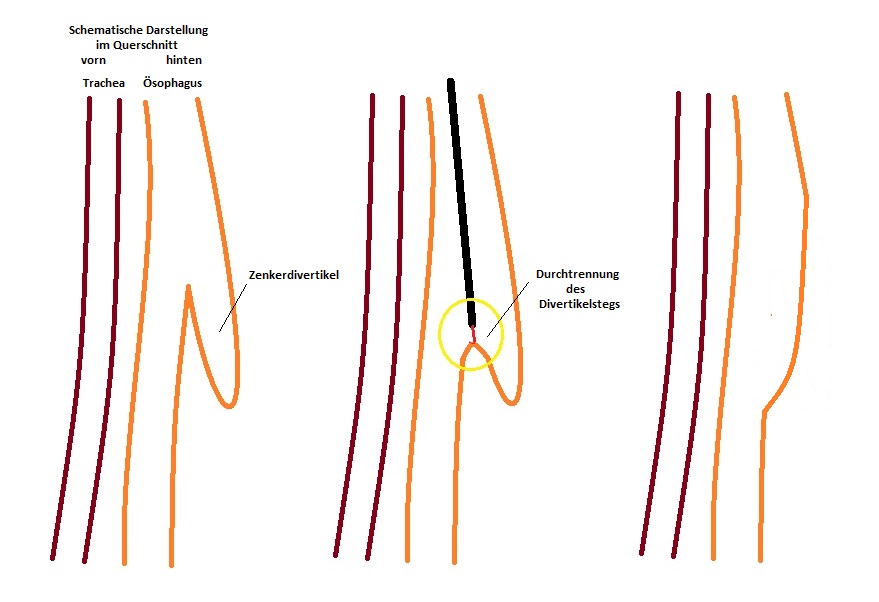 Therapeutisch können wir mittels eines endoskopischen Eingriffes während einer Magenspiegelung den Steg zwischen Speiseröhre und Divertikel durchtrennen. Der Vorteil dabei ist die Kürze des Eingriffs ohne Vollnarkose mit einem deutlich geringeren Risiko im Vergleich zu einer chirurgischen Versorgung des Divertikels.
