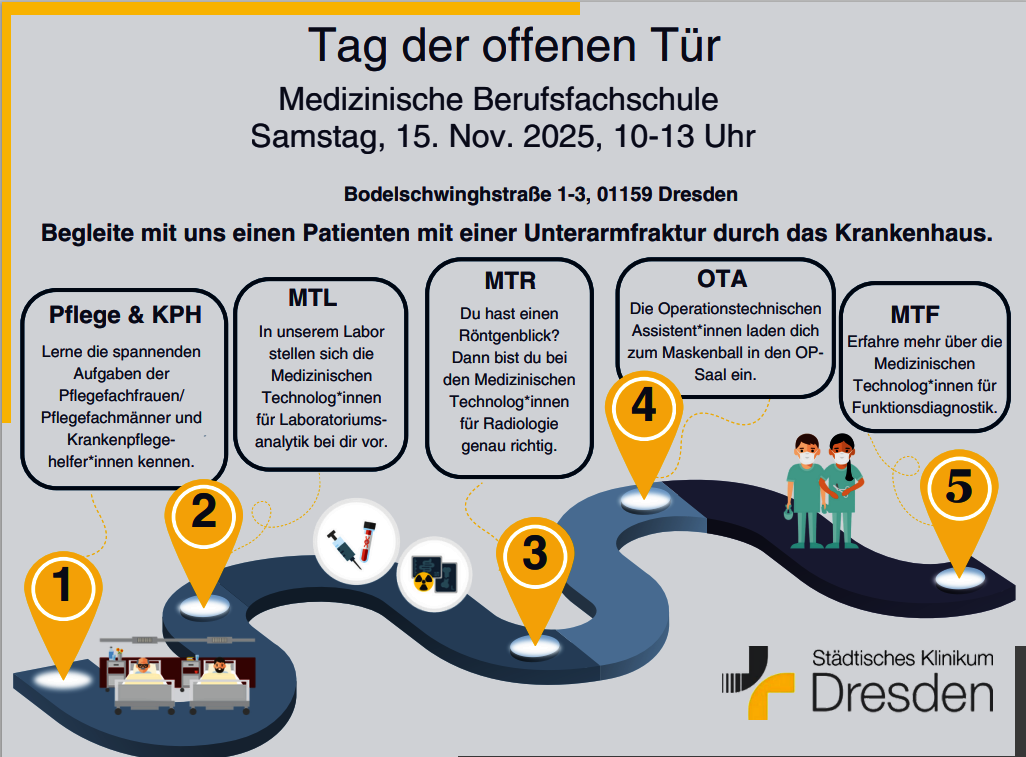 Ausbildungspfad in Pflege, Operationstechnische Assistenz (OTA), Medizinische-Technologie für Laboratoriumsanalytik (MTL), Medizinische-Technologie für Radiologie (MTR), Krankenpflegehilfe (KPH) und Medizinische-Technologie für Funktionsdiagnostik (MTF).