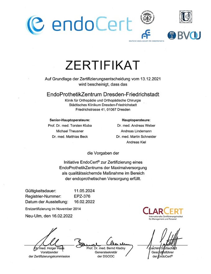 Jede Operation wird von einem Hauptoperateur oder Senior-Hauptoperateur durchgeführt oder begleitet. Hauptoperateure müssen jährlich eine Mindestanzahl von 50, Senior-Hauptoperateure von 100 Endoprothetik-Operationen vorweisen können. Außerdem müssen sie die Teilnahme an Weiterbildungen belegen. So können Patienten stets auf die Erfahrung und Weiterentwicklung unserer Operateure vertrauen.